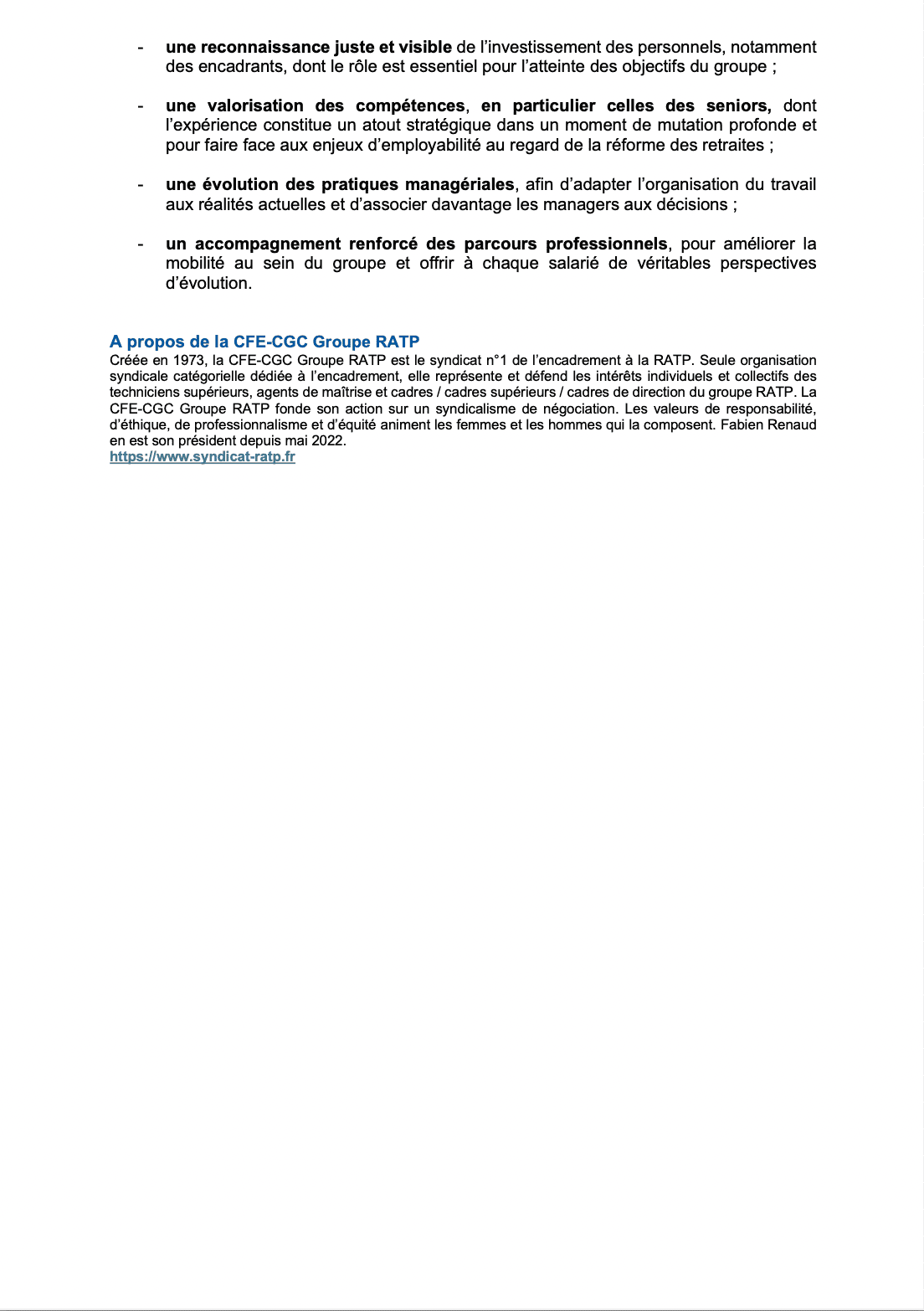 RATP - La CFE-CGC fixe ses exigences au futur président